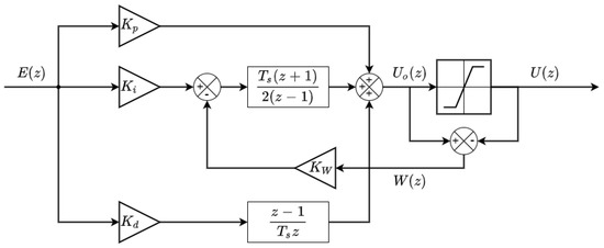 Figure 4 shows the block diagram of the discrete-time PID control method implemented in the APR-02 mobile robot to control the angular rotational velocity of the BDCM model P205-2S.12.64 (displayed in Figure 2). The PID control method implemented in the electronic board uses a discrete-time version of the classical PID proposal. The controller has been discretized using the Tustin method (or Trapezoidal method) for the integrator and the forward Euler method for the derivative part [9]. This implementation includes a classic anti-wind-up system to prevent the integrator accumulating a large error [9]; the conventional PID output control signal is saturated in to limit the output control values to the physical limits of the control electronics and a negative feedback is introduced in the integrator part of the PID when the output control signal tends to overpass the saturated control signal. The parameter used in this implementation has been set to 39.025 according to the rule of thumb proposed by Dastjerdi et al. [54]: