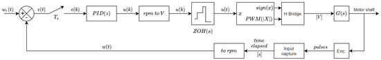 Figure 5 represents all of the blocks implemented in the PID closed control loop, in which the PID part is executed periodically (every ) in the electronic control board. This control loop mixes discrete modules such as the controller with the Laplace continuous model of the BDCM G(s) using a zero-order hold ZOH(s) in between. In this control loop, the target angular velocity expressed in rpm units is compared with the current estimation of the angular rotational velocity of the motor , also in rpm units. Both angular velocities are expressed in rpm instead of rad/s or normalized units in order to simplify the practical application of the PID controller and the interpretation of the control task in the APR-02 mobile robot, which uses rpm in its path planning procedure [49]. The error signal expressed in rpm is sampled at intervals and applied to the discrete PID controller module, , which generates the discrete control signal used to control the motor, which is also expressed in rpm.