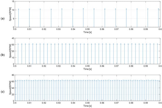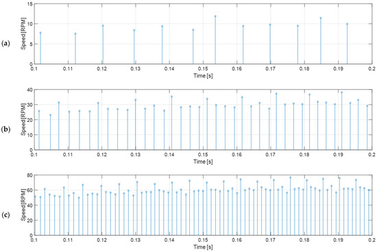 Open-loop wheel speed measurement deduced from the raw time-elapsed edge measurements gathered from the magnetic encoder of the BDCM for the different PWM duty cycles applied: (a) 20% or low-speed example; (b) 50% or medium-speed example; (c) 100% or full-speed example.