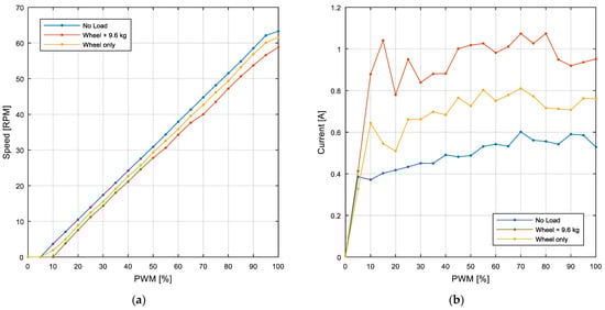 (a) PWM and RPM relationship in different load scenarios. (b) Motor current consumption depending on the applied PWM duty cycle in different load scenarios.
