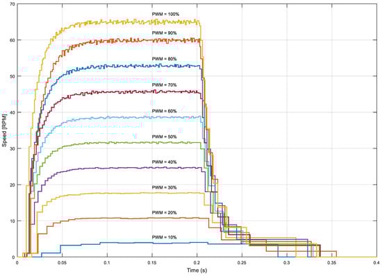 This section is provided in order to shows the open-loop dynamic evolution of the angular rotational velocity of the omnidirectional wheel extracted from the information gathered from the low-cost magnetic encoder (the shown speed represents the output angular rotational speed of the wheel; to obtain the information at the motor shaft, just multiply the speed by 64). Figure 10 shows the open-loop dynamic evolution of the angular rotational velocity when applying a step from 0 to M% duty cycles with PWM at t = 0.0 s and a step from M to 0% at t = 0.2 s; the values of M are 10, 20, 30, 40, 50, 60, 70, 80, 90, and 100%. As described before, the number of speed samples provided by the encoder attached to the motor depends on the rotational angular speed of the motor as a side effect of the method used for the angular rotational velocity calculation. This effect reduces the amount of information gathered at low angular velocities (such as the duty cycle PWM = 10%) and when the motor is starting to rotate. Figure 10 shows that the cases in which a high PWM (such as 90 or 100%) is applied to the BDCM offer much more motor speed information than the cases with a low PWM (such as 10 or 20%), so the control of the motor will be easier at high speeds rather than at low speeds.