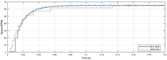 Finally, Figure 11 shows the details of the transitory result obtained in the case of applying a duty cycle PWM step from 0 to 100% at t = 0.0 s (blue line), in which the motor is accelerating, and also shows the deceleration obtained when applying a PWM step from 100 to 0%, obtained at t = 0.2 s (brown line), but in this figure it has been inverted (maximum speed minus instantaneous speed) and moved to t = 0.0 s in order to compare both the acceleration and deceleration curves. In a theoretical case, these two curves must be identical, so it should be expected that the combination of both transitory curves will provide a more detailed description of the open-loop response of the motor by overcoming the encoder’s limitations, for example using the information from the deceleration from 0 to 0.02 s and the information from the acceleration after 0.02 s. The specific practical application of the combined acceleration and deceleration curves will be analyzed in future works.