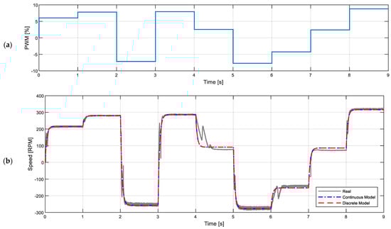The application of this motor modeling toolbox will be tailored to provide a transfer function model with two poles, no zeroes, and no delay, which is the standard function used in brushed DC motors. The calibration data used for this paper are composed with a sequence of 9 different PWM duty cycles applied to the motor during one second and the recording of the angular rotational velocity of the motor at a fixed sampling rate of 1 kHz. Figure 12a shows one sequence example at 50, 65, −60, 66, 35, −64, 35, 20, and 73%, and Figure 12b shows the recorded angular evolution and response obtained with two-pole continuous and discrete models. The transfer functions of the motor model obtained in continuous time and in discrete time (sampling time of ) are: