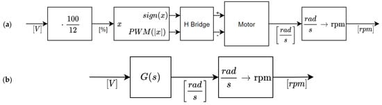 This section provides a specific validation example of the models obtained in the previous sections. Figure 13a symbolizes the real DC motor setup, where the voltage applied to the motor must be first converted to a PWM value and then applied to the H-bridge that controls the motor. Figure 13b symbolizes the blocks used to simulate the DC motor model in continuous time.