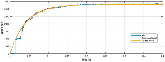 Figure 14 compares the step response (from 0 to 12 V at t = 0.0 s) obtained with the measurement of the real motor response and the simulation of the continuous and discrete models. Figure 14 shows the real information gathered from the magnetic encoder (blue line) and the typical theoretical evolution obtained from a function with two poles, no zeroes, and no delay.