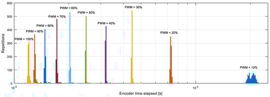Histogram of the encoder’s time-elapsed () values obtained with different PWM duty cycles (cases represented in Figure 9a with no load), colored in order to differentiate the cases analyzed.
