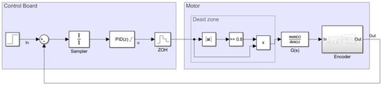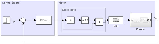 The behavior of a PID controller is defined by the value of its , , and parameters. The baseline or reference values of these controller parameters were obtained using the frequency-response-based (FRB) PID tuner integrated in the Simulink® software [63]. This tool requires the creation of a control loop model in Simulink® using the motor model previously described in this paper. The block description of this modeling is provided in Figure 16 and Figure 17 based on continuous and discrete PID controller implementations. The model of the motor contains various nonlinear elements that attempt to replicate the behavior of the real system. For improved reliability, the behavior of the encoder was also modeled in Simulink® to be as close as possible to the real one by computing the rotation of the shaft of the motor, internally defining the quadrature encoder signal and finally providing a realistic time-elapsed sequence that is used to provide the same information as the real encoder.