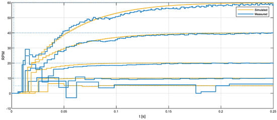 BDCM output in a closed-loop PID control: real evolution of the angular rotational velocity measured from the information gathered by the magnetic quadrature encoder (blue line) and simulated motor velocity (yellow line). Response to steps with target speeds of 5, 10, 20, 40, and 60 rpm.