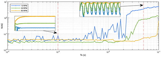 Evaluation of the NIAE values for different sampling periods () and different target speeds: 10 (blue line), 30 (green line), and 60 (yellow line) rpm.