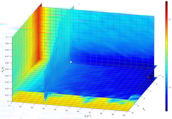 Figure 21a shows the details of the horizontal plane for = 0.0182 s (the default value proposed by the FRB PID tuner procedure), where the white point depicts the location of the NIAE computed with the default PID parameters, while the red point depicts the location of the minimum NIAE computed in this plane. Similarly, Figure 21b shows the horizontal plane for = 0 s, where the red point depicts the location of the minimum NIAE found in this plane, while the white point is the approximate projection of the NIAE computed with the default PID parameters. As a result of this exhaustive 3D search, the minimum NIAE value obtained was 0.462, corresponding to parameter values ,, and . These values differed by 0%, 134.5%, and −100%, respectively, from the reference PID parameters obtained with the FRB PID tuner procedure (,, and ), which provided a baseline reference NIAE value of 0.996, which represents an improvement of 53.6%.