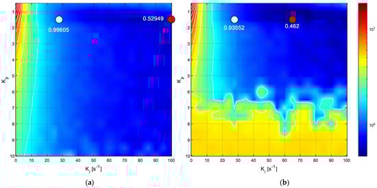 Details of the two horizontal planes defined in Figure 20. The white point depicts the location or projection of the NIAE baseline values obtained with the FRB PID tuner procedure while the red point depicts the location of the minimum NIAE in each plane. The values of the NIAE are also displayed for reference: (a) plane with ; (b) plane with .