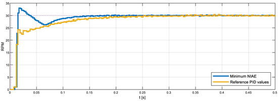 Finally, Figure 22 compares the step responses generated with the reference PID parameters obtained with the FRB PID tuning procedure and the optimal PID parameters found, which minimize the NIAE (obtained empirically through an exhaustive search based on measuring the step transient in the real motor). Figure 22 shows that the optimal PID parameters generate a faster initial response in the DC motor while minimizing the undershoot. Please note that the overshoot and undershoot are computed as the cumulated absolute difference between the target velocity and the real motor velocity (see Equation (2)). The undershoot area generated with the reference PID parameters (NIAE = 0.99605) doubles the overshoot and undershoot areas obtained with the optimized PID parameters (NIAE = 0.462). This improvement was found to be similar in the angular rotational velocity range of the motor used in this paper. In the case of a mobile robot application using a PID control in the motors that drive the wheels, a minimum NIAE means a minimum difference between the target angular rotational velocity specified by the path planning algorithm and the expectation of a minimum trajectory divergence at the end of the motion.