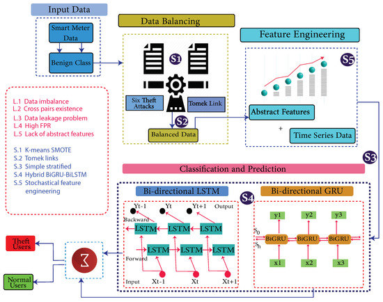 A major portion of NTLs is due to fraudulent behavior of the consumers’ accomplishing an effort to bypass the Utility Provider (UP) surveillance and to under-report the consumed energy. A solution proposed in [11] adopts a data-driven approach which uses a Machine Learning technique, Ensemble Bagged Tree (EBT) algorithm by stacking many Decision Trees to detect NTLs. As time complexity and memory consumption due to large computational complexity have remained formal constrains for Machine Learning (ML) algorithms. To improve both, searching and Weighted Feature Importance (WFI) techniques are deployed to enhance theft detection schematics. A Gradient Boosting Classifier (GBCs)-based detector is used to detect anomalies by considering intentional remedies while non-fraudulent anomaly intervention is ignored. Furthermore, the Gradient Boosting Theft Detector (GBTD) for the classification purposes is pursued by a preprocessing module using WFI. WFI uses stochastic features such as mean, min, max and Standard Deviation in collaboration with the consumption pattern extracted features, which improves performance and reduces time complexity [12]. The author pinpoints the Detection Rate and FPR only, however, a clustering mechanism is required to be considered in order to identify the misclassification due to a sudden drop in the consumption, which is ultimately started before the period of analysis. During training of the model, a problem of data leakage occurs which is not tackled properly. In [13], a maximal overlapped discrete wavelet packet transform is used to extract the abstract features from the dense time-series electricity consumption data, whereas, to tackle the data balancing issue, a random under-sampling boosting (RUSBoost) algorithm is proposed, which eliminates vital information of the data while re-sampling the data samples. Similarly, [14] uses SMOTE for data balancing. The balanced data are then preprocessed using a min–max scalar normalization method to refine the input raw data. A pool of various algorithms is used containing AdaBoost, Cat-Boost, XGBoost, LGBoost, RF [15] and extra trees to find FPR and Detection Rate, however, SMOTE over-samples the minority class, with confused pairs having trace contents of both classes. The generalization performance of single hidden-layer feed-forward neural networks (SLFN) due to over-training leads to degradation when the back-propagation algorithm performs. To overcome such issues, a hybrid Convolutional Neural Network and Fandom Forest (CNN–RF) is proposed, where the CNN is designed to learn features between different hours of the day [15]. Obtained features are taken as an input by Random Forest (RF) to segregate thieves from honest customers. However, memory elapsing is a serious issue to monitor consumption patterns for long periods of time. The RF module takes a lot of memory, causing over-fitting issues. Significantly, a fast operation is an optimum choice, whereas operating maxpooling is a slower operation and causes greater time of execution. Furthermore, due to the non-availability of real-world theft scenarios, data analyzing classification based only on linear Theft Cases is not a significant investigation scenario. Similarly, a hybrid module integrating Convolutional Neural Network and long-term short-term memory (CNN–LSTM) has been developed [4]. CNNs have the capability of self-learning, whereas LSTM performs better on sequential data, however, memory elapse is still a question for such scenarios. A Semi-Supervised Auto-Encoder (SSEA) is used to learn the advanced features [16]. The input of multiple Time-Series Data is organized as a 1D vector in multiple channels. Moreover, to improve a linear separability of the samples, a distributed stochastic neighbor embedding (t-SNE) is used to localize each data point. Adding a high dimensionality though class separation is a pre-requisite for such a scenario, which is not simply tackled by t-SNE to add dimensionality for the class separation. Data leakage during training of the model and the consideration of non-malicious factors are important aspects, however, [17] pays no attention to these issues. Furthermore, the authors in [18,19] adopt a data-driven approach using a Machine Learning technique, XGBoost, without considering any auxiliary information. The study in [20,21] investigates the impact of imbalanced data. The imbalanced data are balanced through synthesized data. The data reductionality is carried out through Principle Component Analysis (PCA) and hyper parameters are tuned through Bayesian optimizer. An AUC score of 97% is reported using a feed-forward network. The study in [22] uses a hybrid model of graph convolutional network and EU Convolutional Neural Network. CNN is used to capture the latest features. The study in [23] targets the AMI infrastructure to investigate malicious consumers. The benign data are manipulated through cyber attacks. A deep neural network CNNGRU hybrid model is developed to correlate the malicious and benign samples.