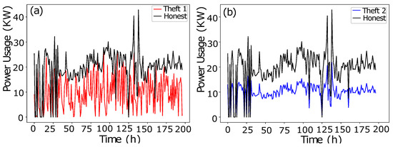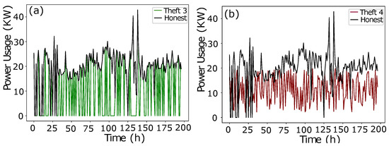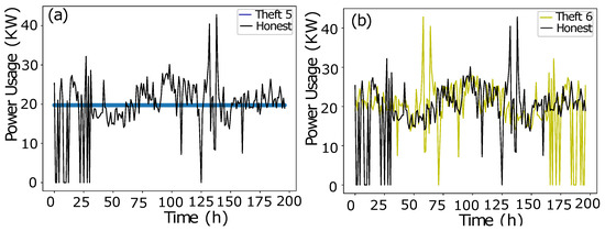 Figure 2. (a) Theft Case 1. (b) Theft Case 2. - The data manipulating technique 2 is shown in Figure 2b. To capture the consumption’s discontinuity, a random number is multiplied to manipulate the honest consumption’s data. Random number multiplication is a series-based discontinuity in the consumption pattern.