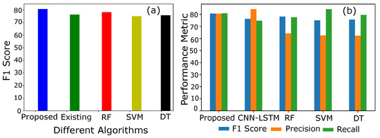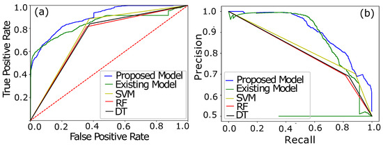 Precision- and recall-based performance of a model is integrated into a single matrix called an F1 score. It is the harmonic mean of the precision and recall. Only a significant increase in both, i.e., precision and recall, can cause an increase in F1 score. Figure 7b shows an equilibrium in precision and recall, which results in a high F1 score, while the existing model has a low F1 score due to imbalance increase in precision and recall. Moreover, the bench mark models such as SVM, RF and DT depict the same scenario of the existing model with high fluctuations in F1 scores.