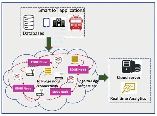 Incredible development in the Internet of Things (IoT) in a decade has led this technology to flourish in various domains. Connecting billions of devices in the physical world through IoT technology has narrowed the gap between the physical and the cyber world. Though many IoT applications have made our lives simpler, it is cumbersome to manage these systems with high security and fidelity. Security and privacy issues are significant concerns to IoT applications [1]. These concerns are so because, due to the unattended randomly placed sensor nodes that are vulnerable to intrusions and attacks, even the data transmitted by sensor nodes are not trustworthy many times. The breach in security may incur huge losses to these systems. Thus, it is indispensable to inhibit such losses to construct a reliable and trustworthy approach [2,3]. Secured data transmission is one of the key challenges in IoT applications. The devices involved in the process of data collection and transmission are more prone to attacks and faults. Some of the applications’ requirements are not only limited to security but also mandate the mitigation of delay, energy usage, and packet loss. Some of the issues such as congestion, delay in transmission, and energy consumption can be dealt with using existing routing algorithms [4,5,6]. Figure 1 shows the cloud-based sensor network having EDGE nodes to send the data to the cloud server for real-time data analysis.