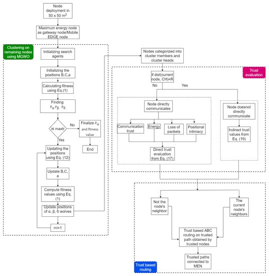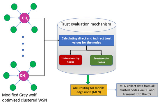 Algorithm 2 shows how nodes are evaluated based on trust values and how untrustworthy nodes are identified. The trusted routing path based on the optimized ABC approach, utilized to transfer data from all trusted nodes to all CHs and then to the MEN, can be achieved with Algorithm 3. Figure 2 represents the flow of the proposed methodology.