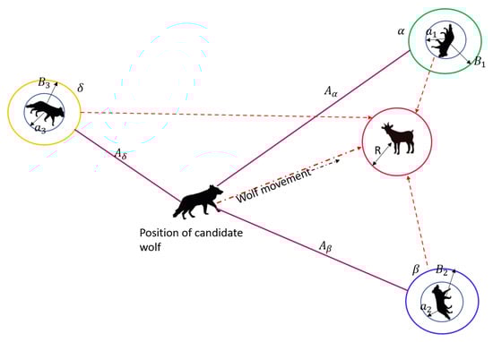 While hunting, gray wolves surround their prey and then attack it. Initially, the location of the prey is unknown. The hunting process is governed by best solutions alpha, beta, and omega and they upgrade their positions using the search agents beta and alpha, shown in Equations (6)–(12).