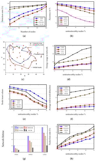 Simulation results. (a) Percentage detection rate versus the number of nodes in the network. (b) Accuracy in % with respect to the increasing percent of untrustworthy nodes. (c) Representation of trusted route and initial route paths for 50 nodes in network size. (d) Evaluation of energy consumption (mJ) of all algorithms for varying percentages of untrustworthy nodes. (e) Trust values of nodes for different untrustworthy node percentages. (f) Average end-to-end delay in ms versus the percent of untrustworthy nodes. (g) Network lifetime evaluation for FND, HND, and LND. (h) Rate in % for packet loss in the network.