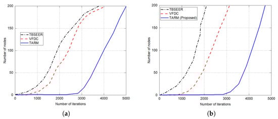 Figure 6a presents the comparison of various approaches in terms of detection rate in percentage while varying the number of nodes. When the network undergoes a high number of detection rounds, the detection rate of the proposed TARM technique to detect the untrustworthy nodes enhances gradually. In Figure 6a, the approaches considered for comparison are VFDC, TEM-MEN, TEC-SFS, and the proposed method. We can see that the rate at which the proposed TARM detects the untrustworthy nodes increases rapidly compared with the TEM-MEN and TEC-SFS, which show a more or less constant increase in the rate of detection. However, TEC-SFS has a good detection rate but the rate of increase of the detection percent in the case of TEC-SFS from zero number of nodes to 200 is not much and it gradually increases at a constant pace. Both TEM-MEN and TEC-SFS show only a 14.6% and 9.5% increase in the rate of detection when starting from the 0th node to 200th node, respectively. At the same time, the TARM offers a 67.6% hike in the enhancement of detection rate from 0 nodes to 200 nodes. TARM has a slightly higher detection rate than the VFDC and TEM-MEN for the maximum number of nodes. Further, it is examined that as the iterations of the moving path enhances, the rate of recognition of trust evaluation correspondingly increases.