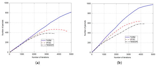 The simulation results for network lifetime, throughput analysis, and energy efficiency are presented in Figure 7, Figure 8 and Figure 9, respectively. The proposed method is compared against the untrusted scenarios of TBSEER and VFDC approaches. Figure 7a depicts the network life for the 25% of untrustworthy nodes out of the total 200 nodes. Similarly, Figure 7b gives the network lifetime analysis for 50% of untrustworthy nodes out of the total 200 nodes. It is noticed that the network lifetime of the proposed TARM method is higher than the other two methods. Figure 8 presents the throughput evaluation for 25% and 50% of untrustworthy nodes out of 200 nodes in Figure 8a,b, respectively.