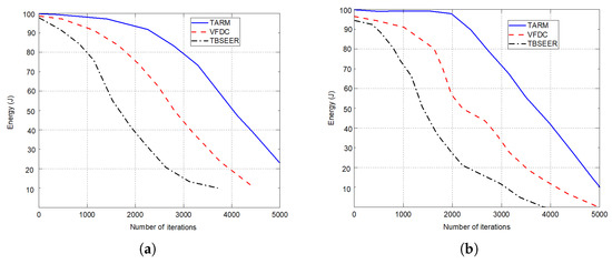 Finally, the efficiency in terms of energy is depicted for both the untrusted scenarios against TBSEER and VFDC methods in Figure 9a,b, respectively. It is observed that for the first scenario—that is, 25% of untrustworthy nodes out of total nodes, the performance of the proposed method is better and sustains for more iterations compared with the second scenario—that is, 50% of untrustworthy nodes out of 200 nodes. This shows that as the number of untrustworthy nodes increases, the performance starts degrading. Hence, the proposed method works on detecting the faulty or untrustworthy nodes and establishing trust routes using trusted nodes in the sensor network.