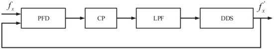 ) according to the rough measurement result. The accurate closed-loop frequency measurement module is a negative feedback structure composed of a phase–frequency detector (PFD), a charge pump (CP), a loop filter (LF), analog-to-digital converter (ADC), field programmable gate array (FPGA), and direct digital synthesizer (DDS).
