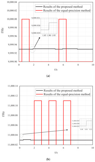 Under the same sampling time of 1 s, the two groups of signals with the frequency of 9999.93 Hz and 11,000.030 Hz are measured using the proposed method and the equal-precision method, respectively. The simulated frequency measurement results are shown in