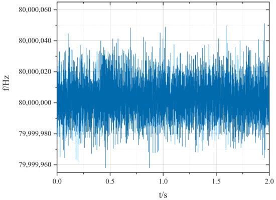 In the specific experiment, the sampling rate of the system is set to 2 kHz, that is, the system completes a frequency measurement and outputs the result every 0.5 ms. Additionally, the tested signal generated by the signal generator is 80.000000 MHz. Considering the stability and timing requirements of system operation in FPGA, the reference signal