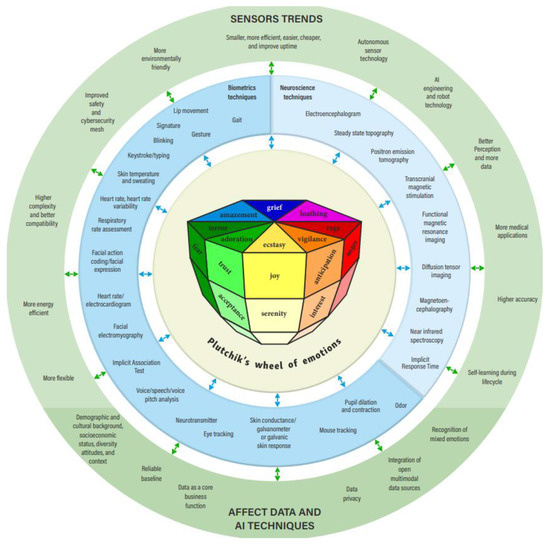 Studies of the applications of affective biometrics can be found in the literature in the fields of brain biometric analysis [15], predictive biometrics [16], keystroke dynamics [17], applications in education [18], consumer neuroscience [19], adaptive biometric systems [20], emotion recognition from gait analyses [21], ECG databases [22], and others. Several works on affective states have integrated multiple biometric and neuroscience methods, but none have included an integrated review of the application of neuroscience and biometrics and an analysis of all of the emotions and affective attitudes in Plutchik’s wheel of emotions.