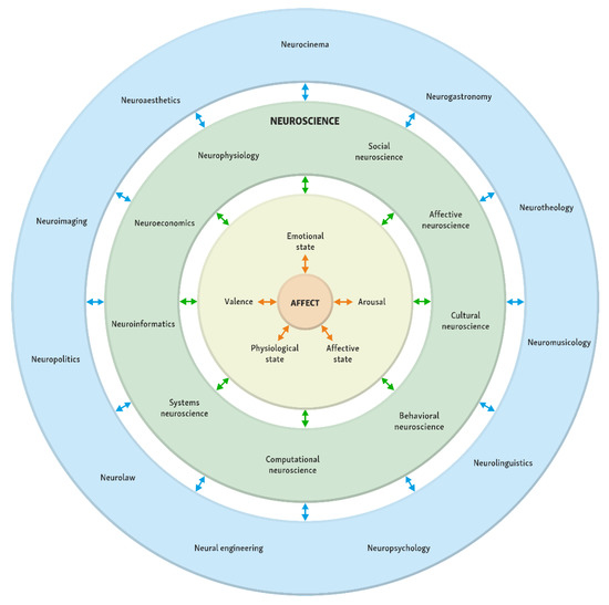 Other branches of neuroscience analyze AFFECT in various related sciences and fields, such as affective neuroscience [199,200], neuroinformatics [201,202], neuroimaging [203,204], systems neuroscience [205,206], computational neuroscience [207,208], neurophysiology [51,209], behavioral neuroscience [210,211], neural engineering [212,213], neuroeconomics [214,215], neurolinguistics [216,217], neuropsychology [218,219,220], neurophilosophy [221,222,223], neuroaesthetics [224,225,226], neurotheology [227,228,229], neuropolitics [230,231,232], neurolaw [233,234,235], social neuroscience [236,237], cultural neuroscience [238,239], neuroliterature [240,241,242], neurocinema [243,244,245], neuromusicology [246,247,248], and neurogastronomy [249,250].
