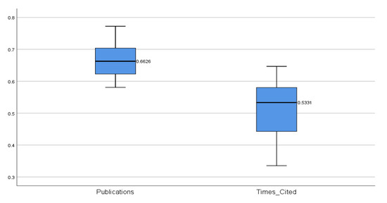 The study’s 7th step presents the median values of the correlations for 169 countries, its publications, and citations (Section 6). It was found that the median correlation of the dependent variable of the Publications—Country Success model with the independent variables (0.6626) is higher than in the Times Cited—Country Success model (0.5331). Therefore, it can be concluded that the independent variables in the Publications—Country Success model are more closely related to the dependent variable than in the Times Cited—Country Success model.