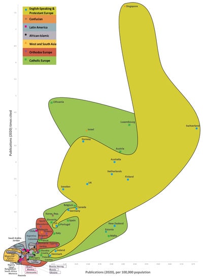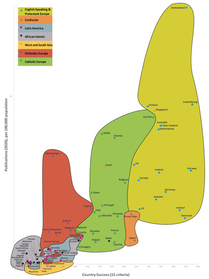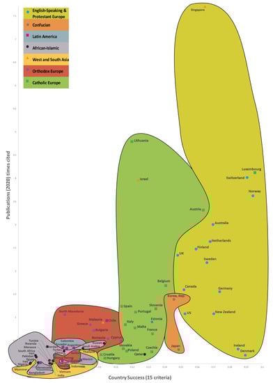 It was found that changes in the values of the Country Success variable explain the variance of the Publications variable by 89.5%, and the variance of the Times Cited variable by 54.0%. Additionally, when the value of the Country Success variable increases by 1%, the value of Publications increases by 1.962% and Times Cited—by 2.101%. As the success of a country increased by 1%, the numbers of Web of Science articles published and their citations grew by 1.962% and 2.101%, respectively. A reliability analysis of the compiled regression models allows us to conclude that the models are suitable for analysis (p < 0.05). The 15 country success indicators explained 69.4% and 51.18% of the number of Web of Science articles published and their citations, respectively.