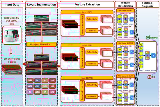 A new CAD technique to identify DR was used in this study to achieve protection against vision loss by using 3D-OCT. To test the proposed system, the study included DR and normal images. The proposed system segmented the 3D-OCT retina layers automatically. Then, it extracted two different features from the segmented retinal layers, which were the first-order reflectivity and 3D thickness. Furthermore, these two features were fused to train and test an NN classifier. The proposed system achieved promising results compared to other ML and DL algorithms. These results confirmed the advantages of the proposed method. In the future, we will try to test the proposed method on more data in order to investigate its robustness. In addition, other ML and DL algorithms will be investigated.