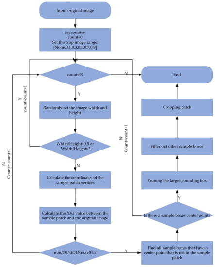 Applying data augmentation techniques would improve the robustness and generalization performance of the model for various input image target sizes and shapes. The improved SSD algorithm makes use of data augmentation techniques, such as randomly flipping each training image with a probability of 50% and randomly altering the image color with a brightness of 0.125, contrast of 0.5, saturation of 0.5, and hue of 0.05. Randomly cropping the picture helps improve the detection precision of small-scale objects. The figure depicts the progress of the random cropping algorithm (Figure 8).