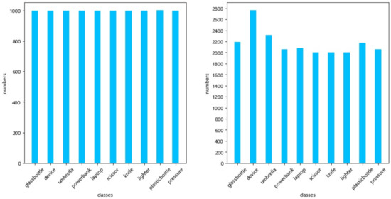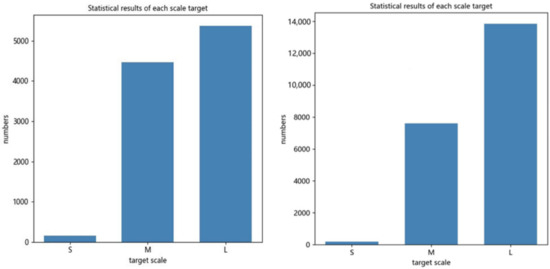 All the datasets utilized in the tests are from the open source EDS dataset of Beijing University of Aeronautics and Astronautics and MEGVII Research Institute, which comprises 14,219 photos from 3 distinct X-ray machines, 10 classes of objects, and 31,655 target instances in total. Existing X-ray imaging technologies display various colors for detecting various objects. Images of inorganic objects are in shades of blue, images of organic objects are in shades of orange, images of mixtures are in shades of green, and images of things that X-rays can not get through are in shades of red. The detected target’s color, size, and shape are used to label different data sets to tell them apart. The network learns how to perform target detection based on existing labeled data. During the training phase, the data set was randomly picked and separated into a training set of 11,375 images designated EDS_10K and a test set of 2843 images in a ratio of 4:1. Five thousand images were taken from the training set and named EDS_5K to facilitate the ablation experiment. Figure 9 shows the sample distribution of the dataset. In general, the target samples are relatively evenly distributed. The uniformly distributed number of targets enables the target detection network to obtain meaningful feature representation capability without overly favoring certain data, improving model generalization capability. In addition, the image detection targets are classified into three classes based on the COCO dataset classification criteria. Detection targets smaller than 32 pixels are classified as “small targets”, detection targets larger than 32 pixels but less than 96 pixels are classified as “medium targets”, and detection targets larger than 96 pixels are classified as “large targets”. The specific statistical figures are shown in Figure 10. Since targets of different scales exist, it is possible to verify the improved algorithm’s detection accuracy for multi-scale targets.