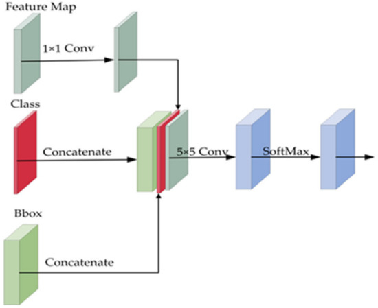 The feature layer extracted by the backbone network is first reduced using 1 × 1 convolution, followed by splicing the output tensor of the feature prediction layer with the output tensor of the classification network and the anchor frame regression network. A 5 × 5 convolution kernel is used in the last layer of the density network to consider the surrounding information. Finally, the results are mapped to the [0, 1] interval by the Softmax operation. The final output dimension is kept the same as the output dimension of the anchor frame regression network. In particular, since the density prediction network needs to use 5 × 5 convolutional kernels to generate the final results, only the first four feature prediction layers are added to the density prediction network. The density sub-network is shown in Figure 14. The total model detection accuracy was improved by 1.2 mAP values. The specific enhancement results are shown in Table 5.