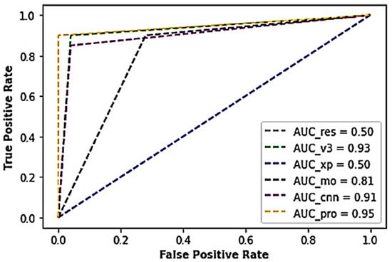 Table 2 illustrates the results of the various experiments conducted during the investigation using the industrial AC Piston dataset. As observed in the table, the voted model yielded an exceptional performance above 97% accuracy. Also, outstanding performance with approximately 90% sensitivity score, 100% specificity score, 93% Cohen kappa score, and a minimal test loss of about 5.24 × 10−2 was recorded compared to the conventional CNN model and Inceptionv3 models that outputted 9.29 × 10−1 and 9.43 × 10−1 accuracies, respectively. In the voting process, the Xception and MobileNet yielded lesser performances with accuracy scores above 70% with higher test loss scores of 5.04 × 10−1 and 1.84, respectively. Although not the lowest in terms of the outputted weight sizes, the voted model was considered for optimality and efficiency because there is a tradeoff between the accuracy and the weight output, as indexed in Table 2. In addition, the proposed model yielded an AUC of 0.95, while the ResNet model outputted the least AUC score of 0.50, as shown in Figure 2.