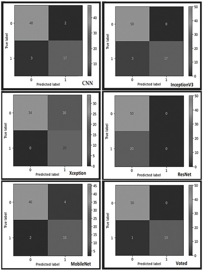A more detailed analysis of the results obtained from the individual learners and the proposed model (see the confusion matrix table in Figure 3 and Figure 4) indicates that the constructed typical CNN model correctly classified 48 piston samples as non-defect pistons from the reserved test samples and misclassified two samples as defect pistons. Also, the CNN model appropriately classified 17 samples as faulty pistons from the bad piston samples and misclassified 3 samples as non-faulty samples. Conversely, the InceptionV3 model misclassified none of the 50 test samples of the good pistons but misclassified three samples of the faulty piston test samples as good out of the 20 faulty piston test samples. Furthermore, the Xception model misclassified 16 test samples of the good pistons as bad out of the 50 samples of the non-defect pistons while classifying all the 20 faulty test samples appropriately. According to the confusion matrix table, the ResNet learner displayed unreliable mixed results, while the MobileNet misclassified four samples out of the 50 good samples as bad, and appropriately classified 18 samples as bad samples. Finally, the voted model yielded superior performance by correctly classifying all 50 non-defect samples as good and misclassifying only one sample of the faulty piston test samples as good.