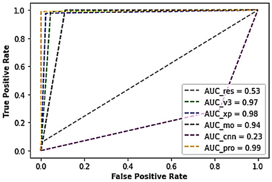 Furthermore, Table 3 represents the results obtained from the various experiments performed during the study using the industrial PCB dataset. As shown in the table, the voted model returned a superior performance of above 99.4% accuracy, about 98.9% sensitivity score, 100% specificity score, 98.9% Cohen kappa score, and a nominal test loss of about 3.80 × 10−2, beating the conventional CNN model and the other competing models. The traditional CNN model and the ResNet50 architecture yielded poor performances with accuracy scores of about 23.3% and 52.8%, with higher test loss scores of 1.43 and 7.15, respectively. Also, the voted model yielded an AUC score of 0.99, while the ResNet model outputted an AUC score of 0.53, Xception 0.98 AUC score, Inceptionv3 0.97 AUC score, typical CNN with 0.23 AUC score, and MobileNet with 0.94 AUC score, as shown in Figure 5.