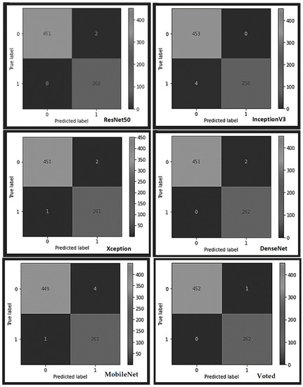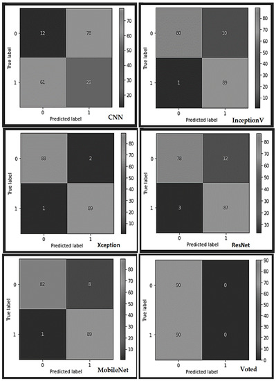 A breakdown of the outcome of each of the learner models and the voted model using the submersible pump impeller casting dataset (see the confusion matrix table in Figure 8 and Figure 9), shows that the built typical CNN model correctly classified all the 452 submersible pump impeller casting test samples as non-defect, except one sample misclassified as a defected sample. The model also identified all the defect test samples without any mistake, thereby yielding an overall superior performance against the other models. All the models yielded good results with negligible misrecognition except the InceptionV3, which misclassified four test samples belonging to the non-faulty class as faulty and the MobileNet, which misrecognized four samples as defected samples instead of non-defect samples.