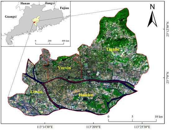Area of study in the core area of Guangzhou, China. The remote sensing image is a Landsat 8 image obtained in 2020 with a spatial resolution of 30 m.