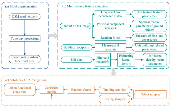 This study consisted of the following three steps, as presented in Figure 2: (1) UFA segmentation; based on topology processing, the revised road vector was used to segment the basic spatial unit of urban function classification; (2) multi-feature extraction from multi-source data; (3) sub-block UFA recognition.