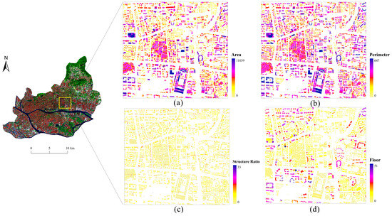 The thematic maps of building footprints: (a) building area; (b) building perimeter; (c) building structure ratio; (d) building floor.