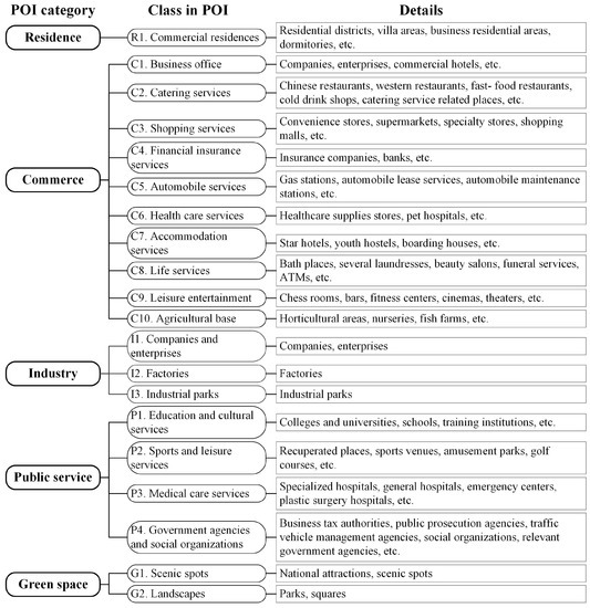 - Hu, Y.; Han, Y. Identification of Urban Functional Areas Based on POI Data: A Case Study of the Guangzhou Economic and Technological Development Zone. Sustainability 2019, 11, 1385. [Google Scholar] [CrossRef]