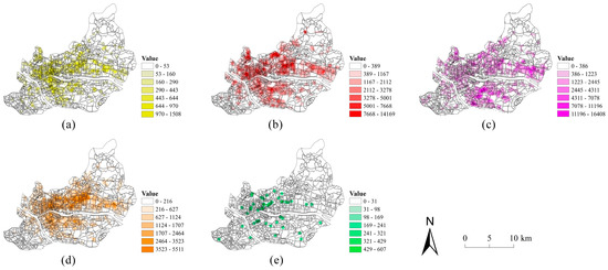 The kernel density estimation of different categories of POIs (a) residence; (b) commerce; (c) industry; (d) public service; (e) green space.