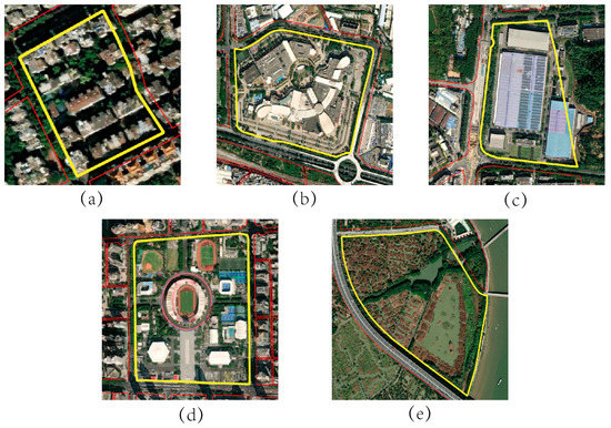 The diagrams of single-function area samples: (a) residential area (R) sample; (b) commercial area (C) sample; (c) industrial area (I) sample; (d) public service area (P) sample; (e) green space area (G) sample.