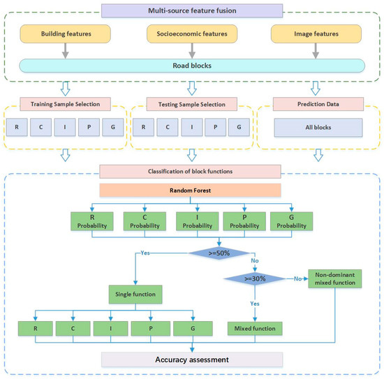 Sub-block functional recognition is based on the random forest classifier. The random forest classifier has high prediction accuracy, high tolerance for outliers and missing values, less manual intervention, and very effective performance in classification tasks [52,53]. This study adopted the Random Forest Classifier from the sklearn for classification. The parameters of Random Forest Classifier from scikit-learn are set as: n_estimators = 50, max_depth = 10, and random_state = 42. By fusing 14 building features, 5 socioeconomic features, and 18 remote sensing image features, function classification at the sub-block level was achieved using a random forest classifier with blocks as the basic units. The classification details are exhibited in Figure 7. The model analyzes the architectural features, socioeconomic features, and remote sensing image features of the five types of single-function areas, and outputs the probability that each block is predicted as the five types of single-function areas.