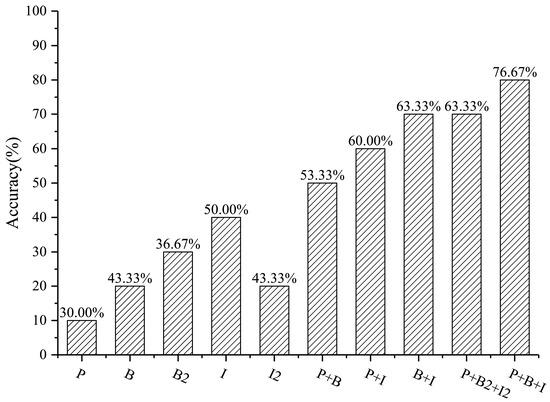 Parallel experiments were set up according to Section 2.3.8, and the recognition results of different features were obtained. The classification accuracy of single-function areas was verified by combining the test samples in this study, and the results are reported in Table 5. In parallel experiments using single-source features, it was found that Image (I) had the highest classification accuracy, and Building2 (B2) without 3D features had the lowest classification accuracy. In the parallel experiment of combining features, the fusion of the three types of features had the highest classification accuracy, the combination of POI + Building (P + B) had the lowest classification accuracy, and the difference in the classification accuracy between the two reached 30%.