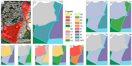 The recognition results of UFAs. (R: residential area; C: commercial area; I: industrial area; P: public service area; G: green space area; RF: mixed-function area dominated by residential use; CF: mixed-function area dominated by commercial use; IF: mixed-function area dominated by industrial use; PF: mixed-function area dominated by public service use; GF: mixed-function area dominated by green space use; GR: mixed-function area of green space and residential use; PG: mixed-function area of public service and green space use; PR: mixed-function area of public service and residential use; PC: mixed-function area of public service and commercial use; CR: mixed-function area of commercial and residential use; IC: mixed-function area of industrial and commercial use; IP: mixed-function area of industrial and public service use; IR: mixed-function area of industrial and residential use; IG: mixed-function area of industrial and green space use; MIX: mixed area without a dominant function.).